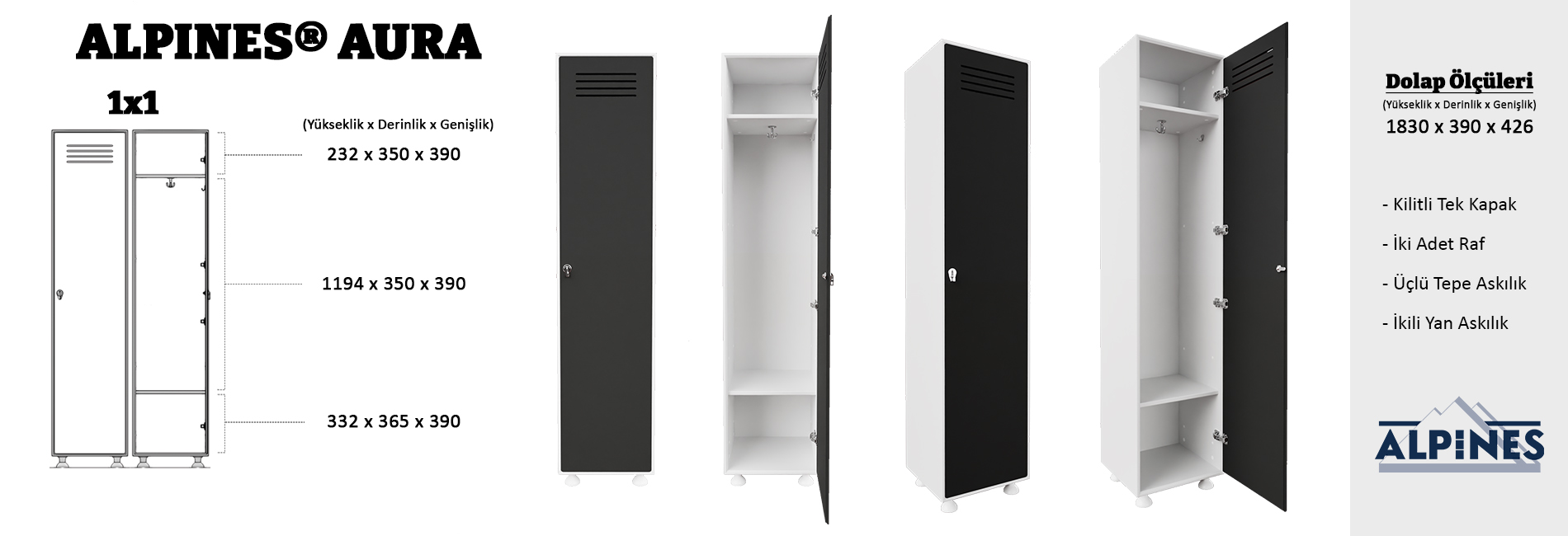 ALPINES® AURA modeli dolapların kapak ve gövde birleşimi sadece ALPINES® ürünlerine özgü bir tasarımdır. Kullanılan özel menteşeler sayesinde dolap kapağı ya tam açıktır ya da tam kapalıdır. Yarı açık dolap kapağı olmadığından tertipli ve düzenli bir ortam sunarak karmaşıklığı önler, göz yorulmasını engeller. PVC kenar bantlarının kullanılmadığı bu tasarım minimalist şık bir görünüm sağlar. Saf malzemenin kendi içerisindeki pürüzsüz geçişleri mekânın değerini arttırır. Son teknoloji elektrostatik toz boya ile kaplı olan yüzeylerde uzun yıllar boyunca renk solması yaşanmaz.