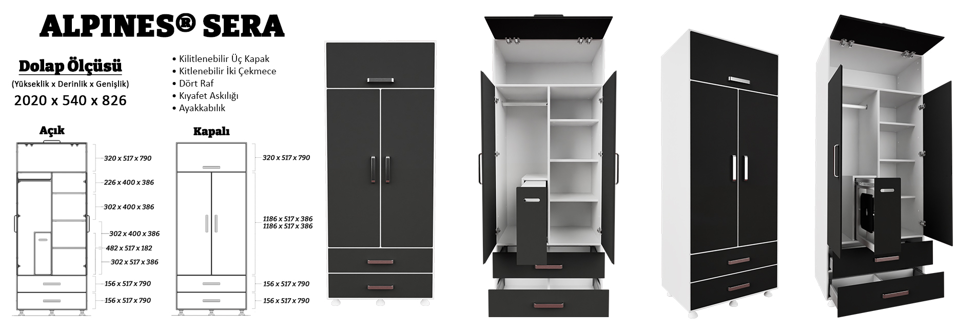 SERA, sade ve şık hatlarıyla modern iç mekânlara uyum sağlarken, geniş iç hacmi ile kullanıcıların tüm ihtiyaçlarını karşılayacak şekilde tasarlanmıştır. Kapak yapısı, mekânda estetik bir duruş sergilerken, kullanışlı bölmeleri sayesinde düzeni maksimum seviyede tutar. Gardırop yapısında olması, kullanıcılara hem konfor hem de geniş depolama alanı sunar.